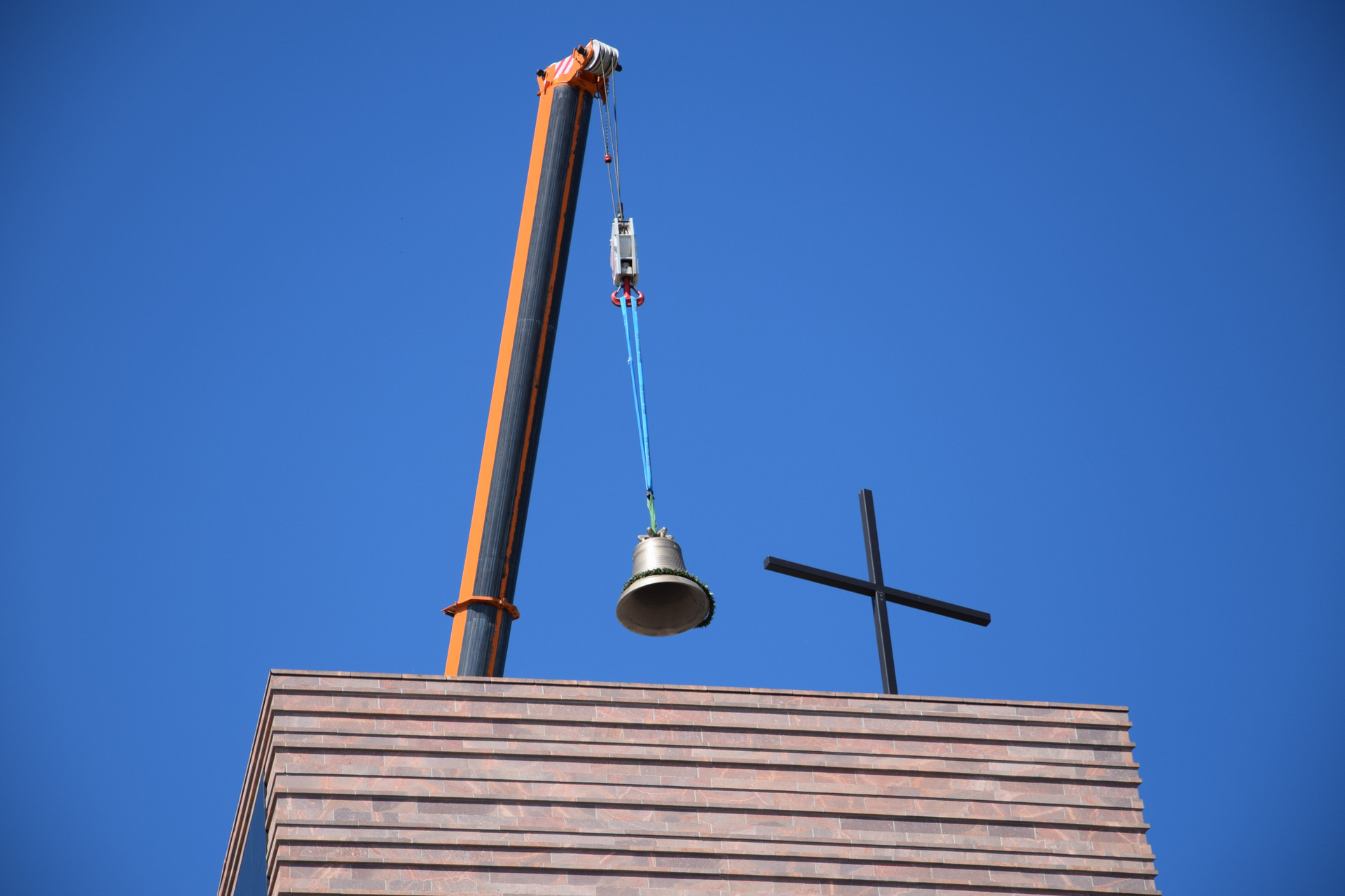 Seit dem 9. Mai sind alle Glocken im Glockenstuhl eingebracht. Ein beeindruckender Anblick bot sich beim Glockenhub. Die bronzenen Glocken zeichneten sich gegen den tiefblauen Himmel ab.