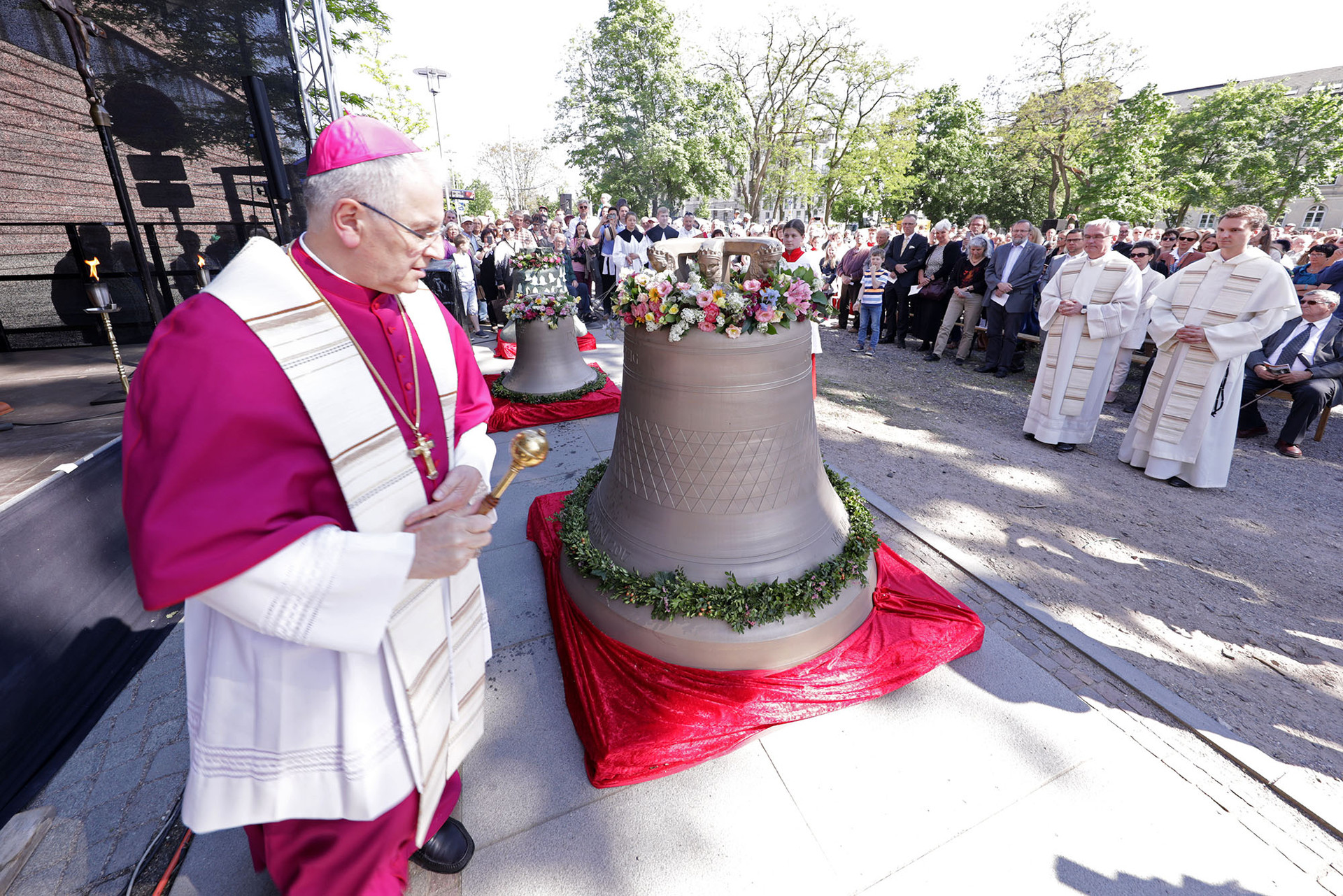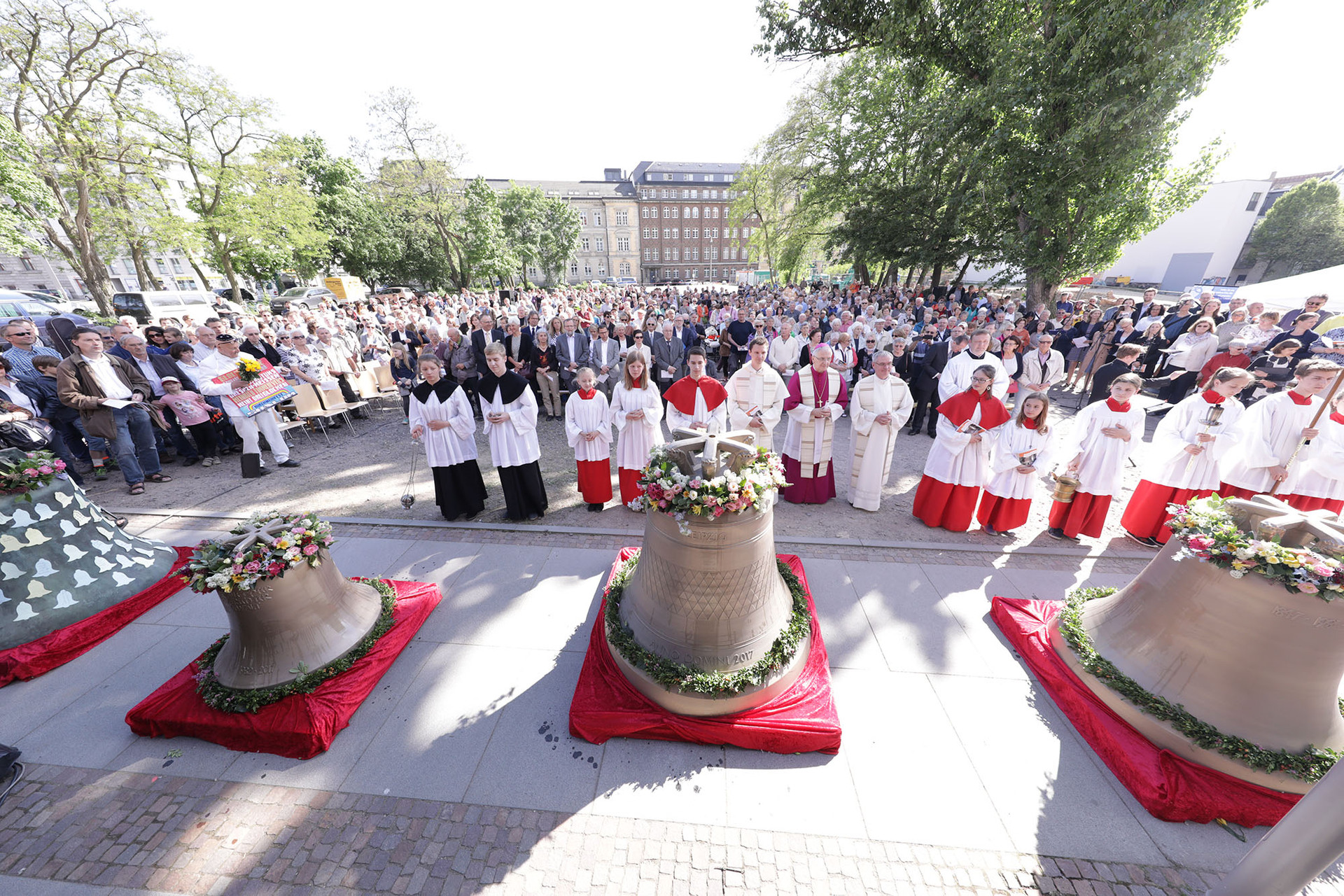 Bei strahlendem Sonnenschein weihte Bischof Heinrich Timmerevers die Glocken der neuen Propsteikirche in Leipzig. Viele Gemeindemitglieder und Gäste wollte sich die Gelegenheit nicht entgehen lassen, die neuen Glocken zu bestaunen, anzufassen und sich mit diesen ablichten zu lassen. Dabei kam es zu vielen emotional bewegenden Momenten.