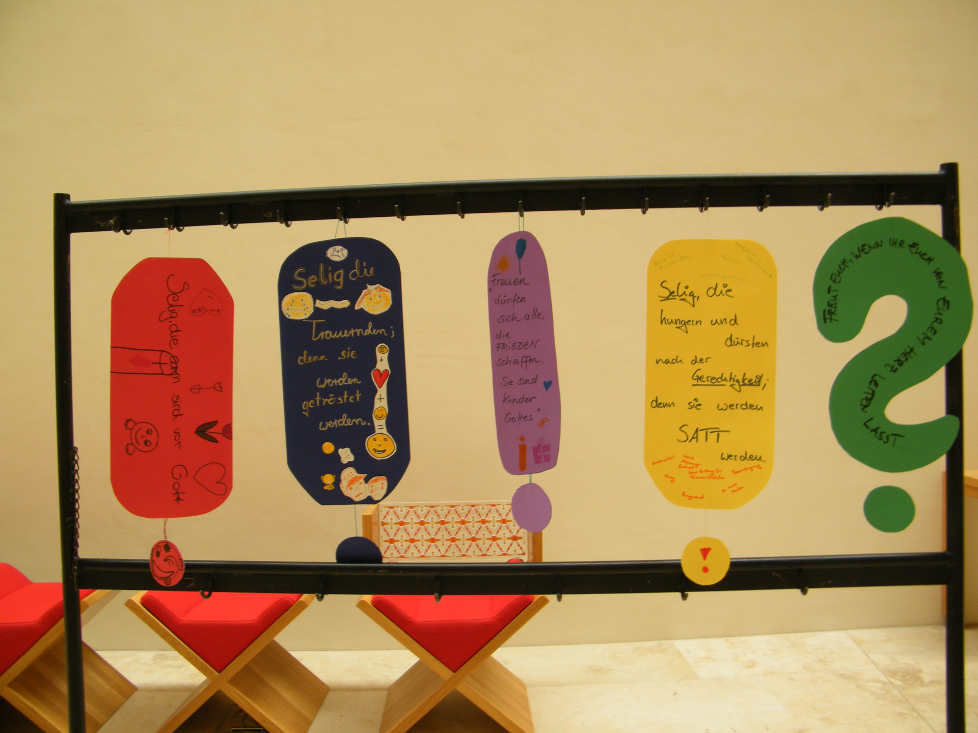 Hinter dem lockeren Spruch „Komm, freu dich mit uns!“ standen thematisch allerdings die Seligpreisungen Jesu, mit denen sich die Kinder und Jugendlichen befassen sollten. Aber kann man sich freuen, wenn jemand arm oder traurig ist, wenn Gerechtigkeit und Frieden fehlen? Am Anfang der Woche standen deshalb viele Fragezeichen. Fünf Tage lang haben die Teilnehmenden dann in vielen Aktionen, mit Spaß und Spiel und einer wunderbaren Wallfahrt am Mittwoch so über die Seligpreisungen nachgedacht, dass am Ende der Woche aus den Fragezeichen Ausrufezeichen werden konnten. Ja, selig sind die Frieden stiften, die nach Gerechtigkeit dürsten, die barmherzig sind – und ja, selig können sogar die Trauernden sein.