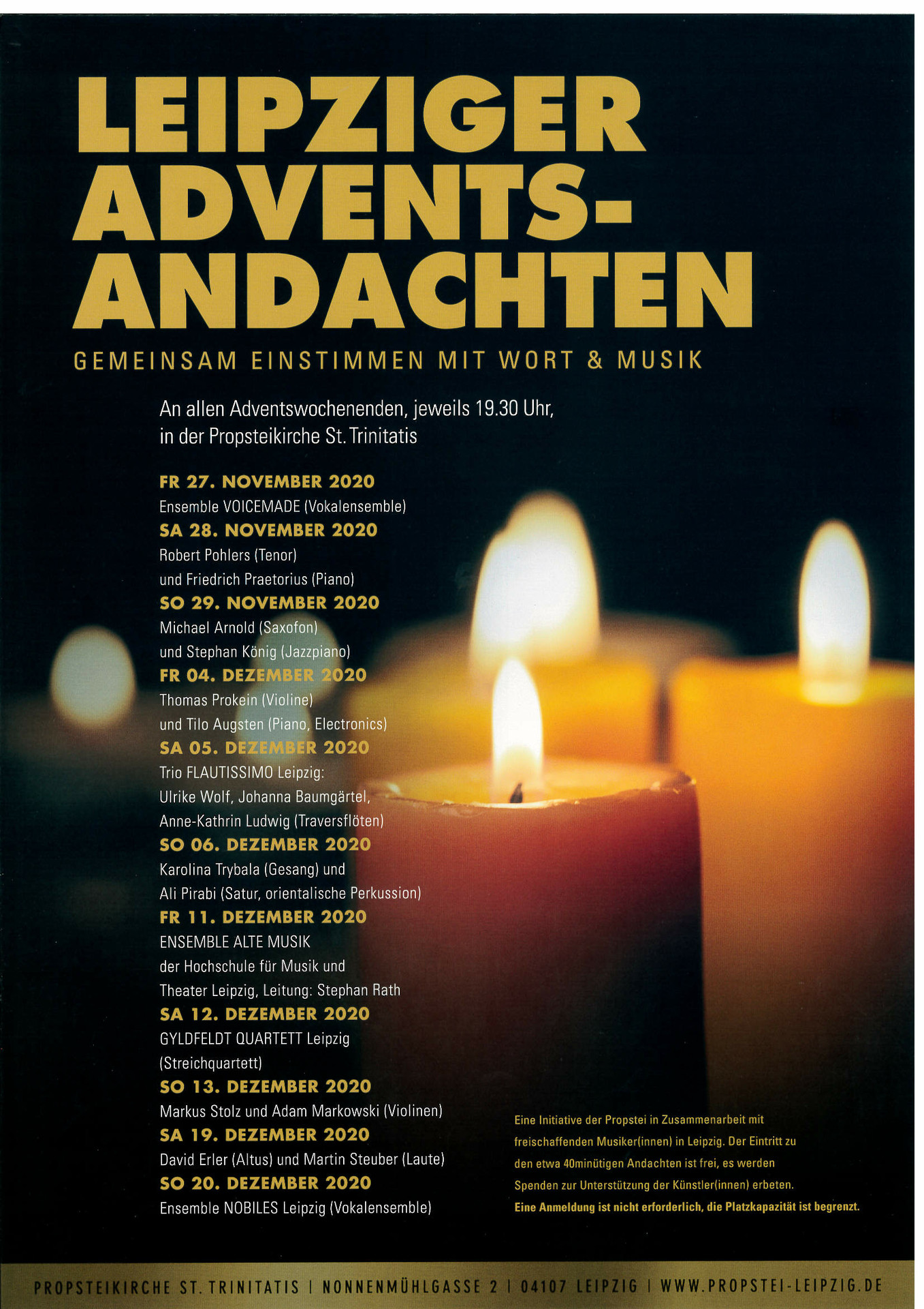 Relativ kurzfristig haben wir die Reihe „Leipziger Adventsandachten“ in unser Veranstaltungsangebot aufgenommen. Damit will die Propsteigemeinde vom Lockdown besonders hart getroffene freischaffende Musiker und Musikerinnen aus Leipzig unterstützen und ihnen ein Forum bieten. An allen Adventswochenenden immer freitags, samstags und sonntags um 19.30 Uhr wird es rund 40minütige Andachten geben, in denen man bei guter Musik und kurzen Wortimpulsen zur Ruhe kommen kann. Den Auftakt machen bereits am kommenden Freitag, 27. November das Vokalensemble „Voicemade“ und Propst Gregor Giele. Alle weiteren Termine entnehmen Sie bitte den im Foyer ausliegenden Flyern und Plakaten. Der Eintritt ist frei, es wird um Spenden für die Musiker und Musikerinnen gebeten. Eine Anmeldung ist nicht erforderlich, die Platzkapazität allerdings begrenzt.