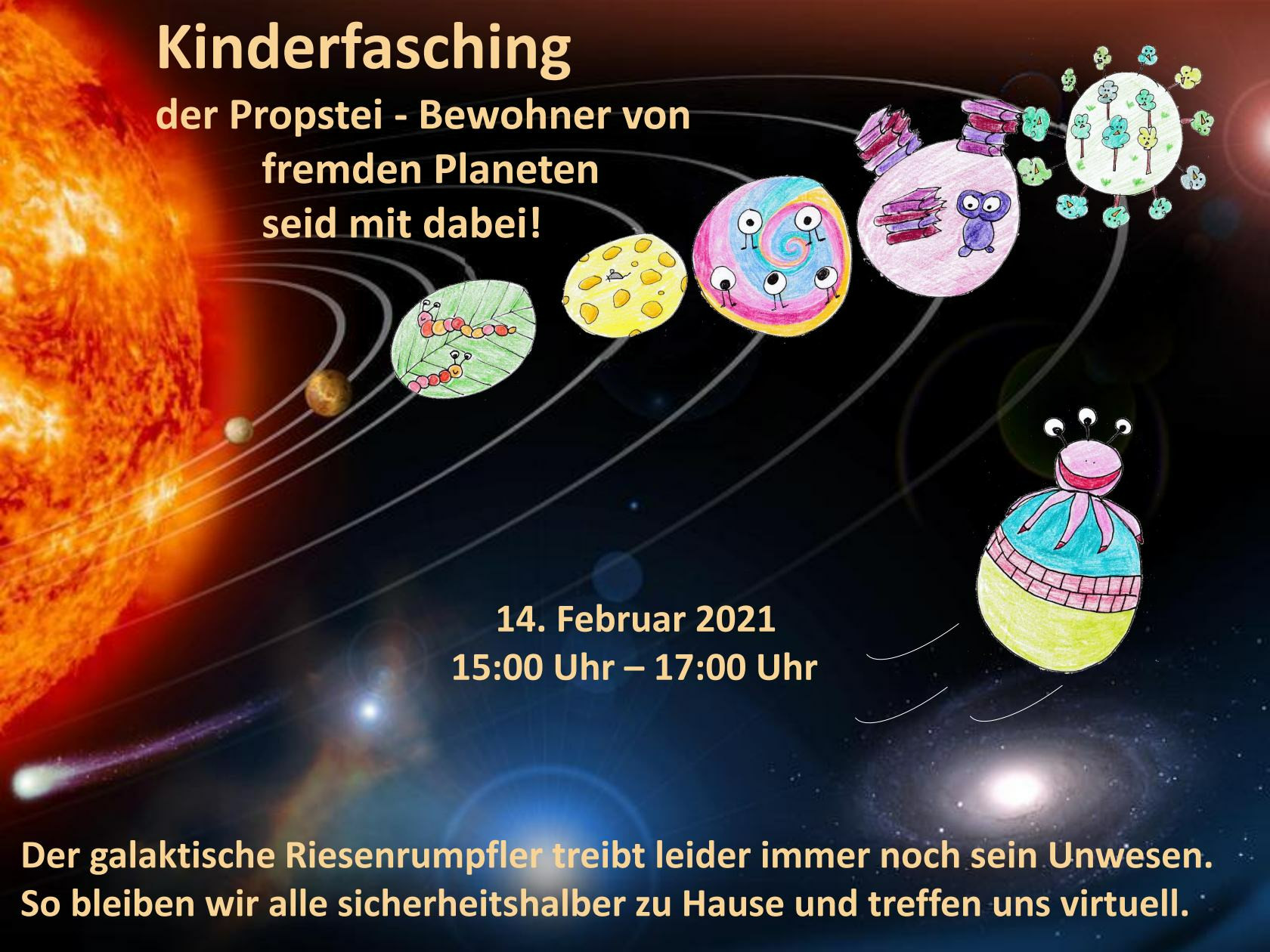 Am Sonntag, 14. Februar, von 15 bis 17 Uhr laden wir euch ein, unter dem Motto "KInderfasching der Propstei - Bewohner von fremden Planeten seid mit dabei!" zu tanzen, zu spielen und zusammen zu sein. Auch bei diesem Fasching gilt: Die Verkleidung kann wild, das Faschingsbüffet ungesund und die Wohnung krass bunt geschmückt sein. Wir wollen auch wieder ein Prinzenpaar krönen.