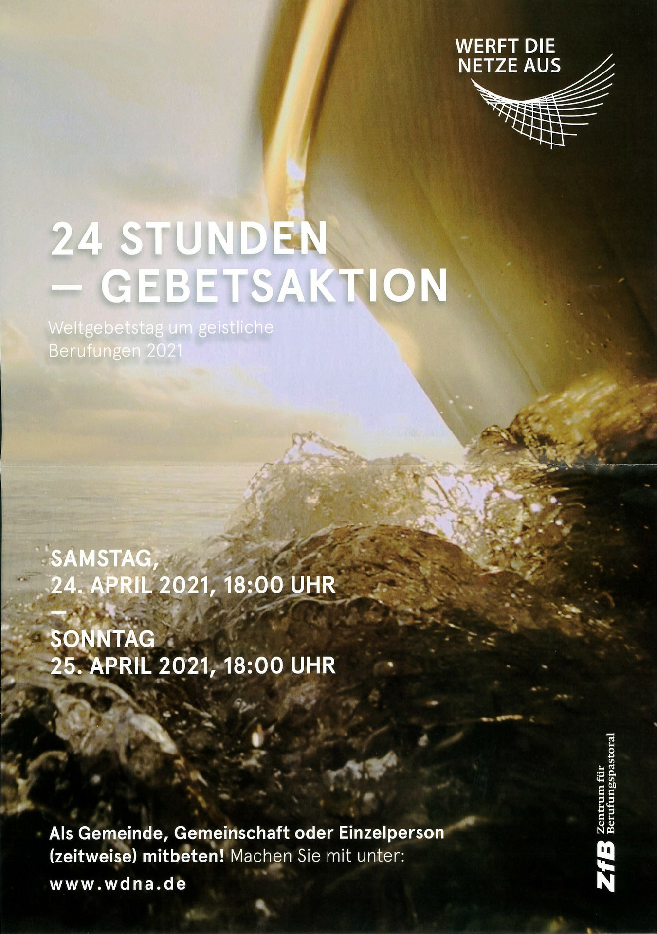 Unter dem Titel „Werfet die Netze aus“ lädt das Zentrum für Berufungspastoral der deutschen Bischofskonferenz ein, vom 24.4.18.00 Uhr bis zum 25.4.18.00 Uhr für geistliche Berufungen zu beten. Dieser 4. Sonntag in der Osterzeit, der früher auch als der Gute Hirte Sonntag bekannt war, lädt in besonderer Weise dazu ein, sich diesem Anliegen zu widmen und insbesondere für Berufungen zum Priestertum zu beten.
