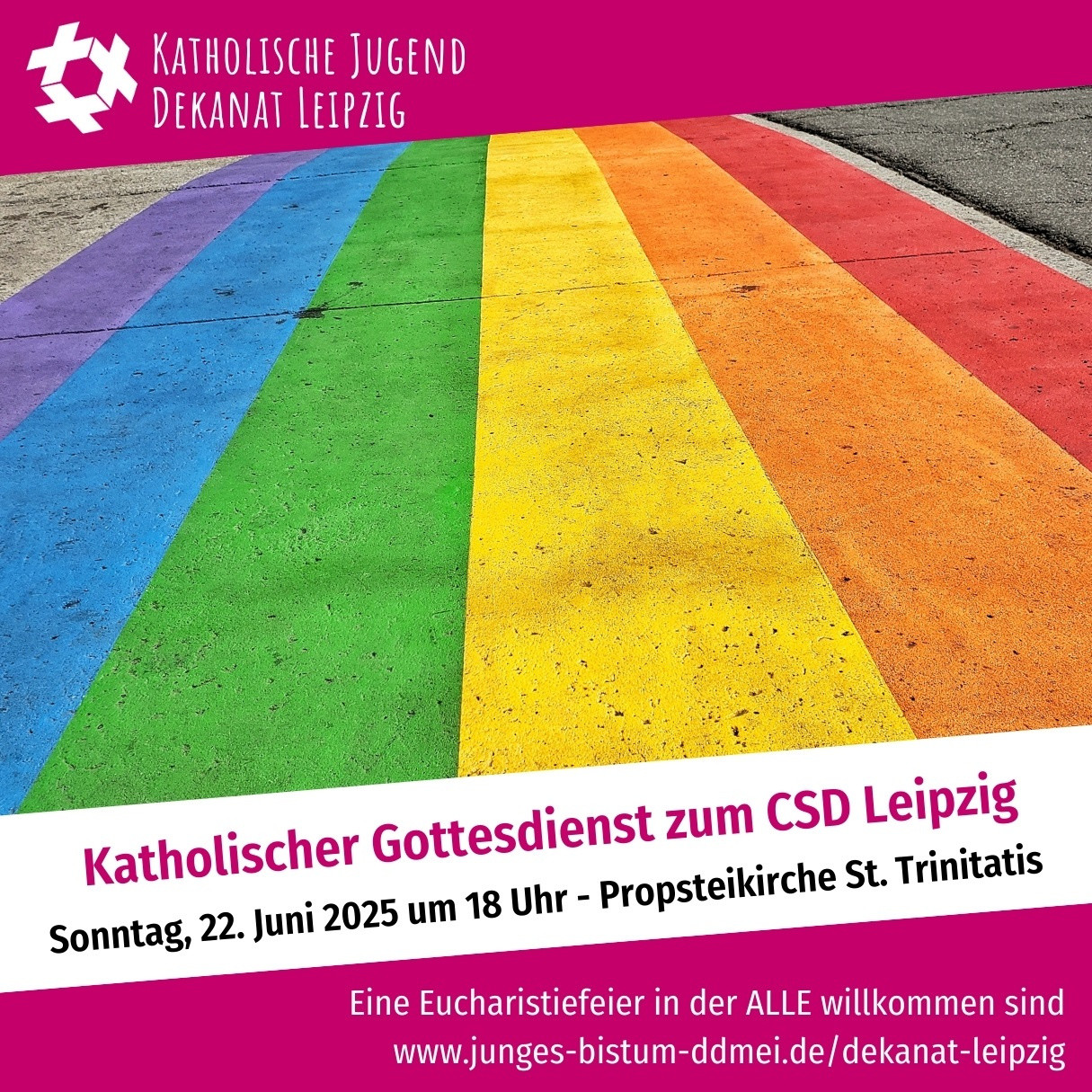 Im Rahmen des Christopher Street Day in Leipzig lädt die Katholische Jugend Leipzig herzlich zum Gottesdienst am Sonntag, 22. Juni 2025, um 18:00 Uhr in der Propsteikirche St. Trinitatis ein. Gemeinsam wollen wir Gottes Liebe feiern, die allen Menschen gilt – unabhängig von Geschlecht, sexueller Orientierung oder Identität.